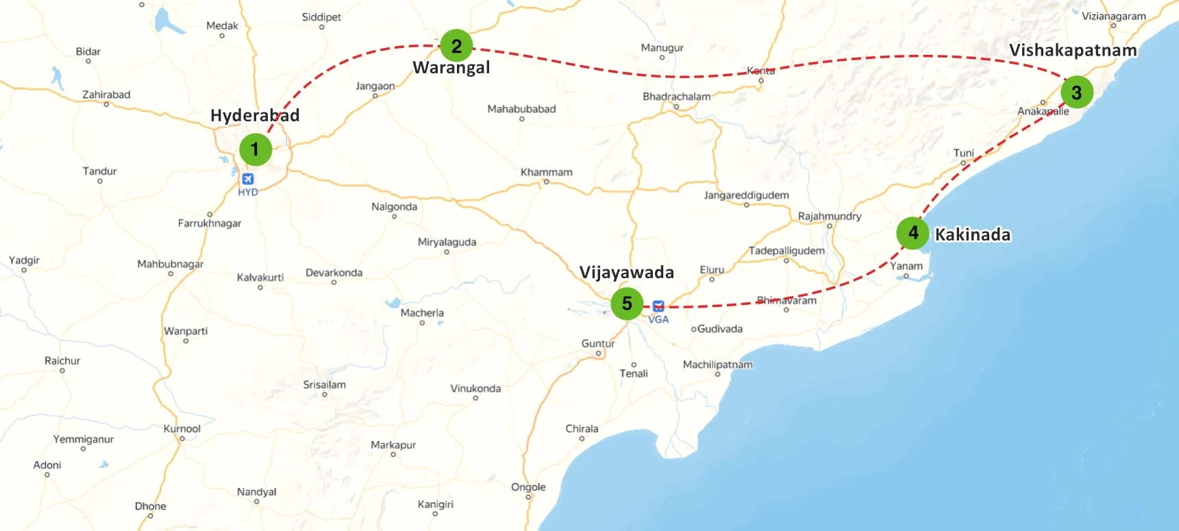 Begin your adventure in Hyderabad, the capital of Telangana, a city renowned for its blend of modernity and tradition. Discover the magnificent Charminar, stroll through the bustling bazaars of Laad Bazaar, and indulge in the famous Hyderabadi biryani. The city's rich history is showcased in landmarks like the Golconda Fort and the Qutb Shahi Tombs. Next, travel to Warangal, a city steeped in history, where you can explore the iconic Warangal Fort and the intricate architecture of the Thousand Pillar Temple. Experience the region’s heritage as you stroll through its beautiful gardens and temples. Continue your journey to Vijayawada, situated on the banks of the Krishna River. Visit the impressive Kanaka Durga Temple perched on Indrakeeladri Hill, and take a moment to enjoy the picturesque landscapes surrounding the city. Next, head to Kakinada, a coastal town known for its beautiful beaches and seafood delicacies. Relax by the shore or explore the local markets to experience the vibrant coastal lifestyle. Finally, conclude your adventure in Visakhapatnam, a bustling port city famous for its stunning beaches and the scenic Araku Valley. Visit the Submarine Museum, stroll along the beaches of R.K. Beach, and explore the picturesque hills and tribal culture of Araku.