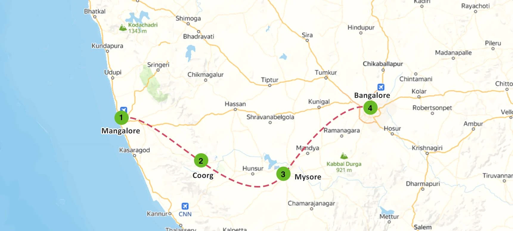 As you embark on this journey with us, take a moment to explore the map and discover the key highlights along your route. Enjoy the serene landscapes of Coorg and the historical allure of Mysore, as each stop enriches your travel experience and invites you to savor the beauty of Karnataka.