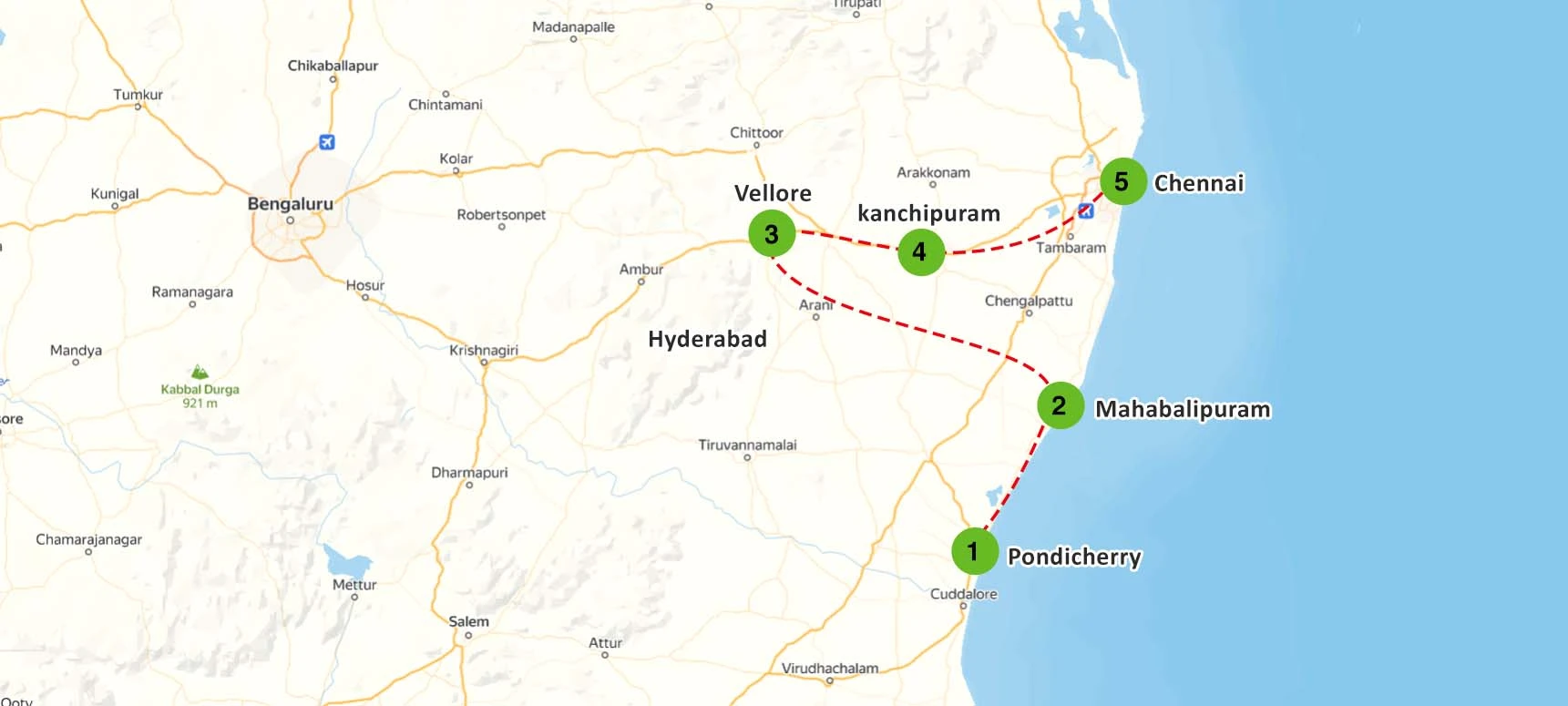 Begin your adventure in Pondicherry, a picturesque town known for its French colonial architecture, serene beaches, and vibrant cafes. Spend two days exploring its charming streets, visiting landmarks like the Aurobindo Ashram and enjoying the tranquil atmosphere at Promenade Beach. Next, journey to Mahabalipuram, renowned for its UNESCO World Heritage Sites, including the Shore Temple and the Pancha Rathas. Marvel at the intricately carved rock sculptures and enjoy the coastal beauty of this ancient port town. From Mahabalipuram, visit Kanchipuram, one of the seven Moksha puris (sacred cities) in Hinduism. Known as the "City of a Thousand Temples," Kanchipuram is famous for its magnificent temples, including the Ekambareswarar and Kailasanathar temples, showcasing stunning Dravidian architecture. Continue to Vellore, where you can explore the majestic Vellore Fort and the beautiful Jalakandeswarar Temple. The fort's historical significance and architectural grandeur make it a fascinating stop on your journey. Finally, conclude your trip in Chennai, the bustling capital of Tamil Nadu. Experience the city's vibrant culture, delicious cuisine, and lively markets. Visit the iconic Marina Beach, the historical Fort St. George, and indulge in shopping and dining at local hotspots.
