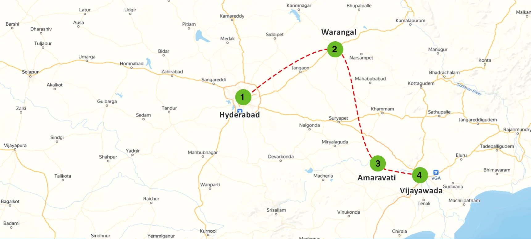 Begin your journey in Hyderabad, the capital city of Telangana, renowned for its historical sites like the Charminar, Golconda Fort, and the bustling markets of Laad Bazaar. Don’t miss a taste of the city’s famous biryani and its vibrant culture. Next, travel to Warangal, famous for its magnificent fort, Thousand Pillar Temple, and picturesque Ramappa Lake, where you can explore the well-preserved remnants of the Kakatiya dynasty. From there, head to Amaravati, an important pilgrimage site and the planned capital of Andhra Pradesh. Visit the ancient Amaravati Stupa and nearby temples that highlight the region's spiritual significance. Conclude your journey in Vijayawada, known for the sacred Kanaka Durga Temple on Indrakeeladri Hill, and experience the local culture, delicious cuisine, and the scenic beauty of the Krishna River.