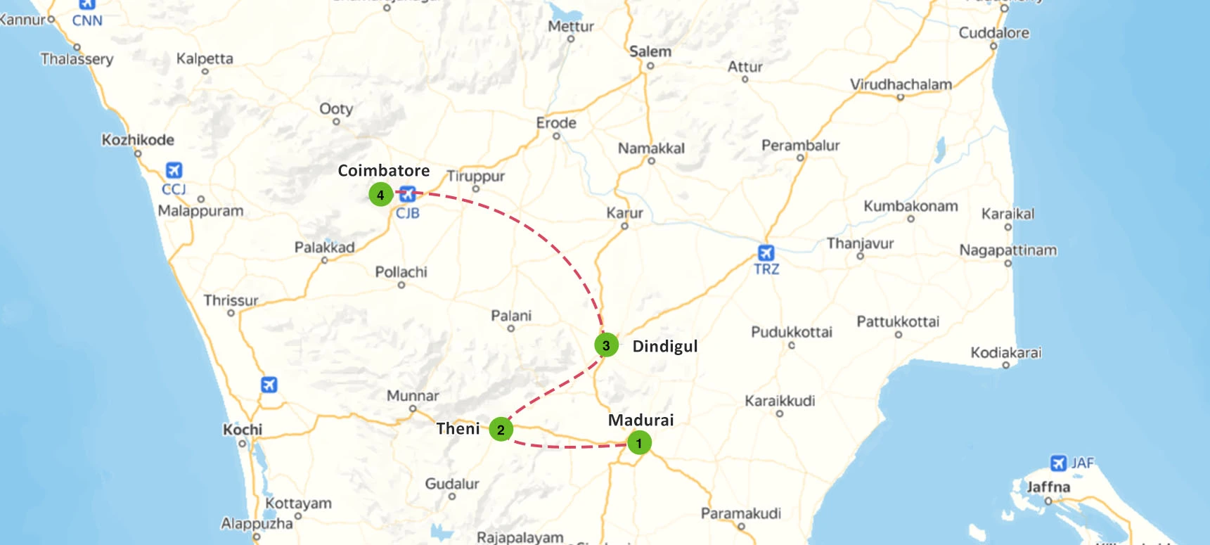 Embark on a memorable journey with our Madurai - Theni - Dindigul - Coimbatore itinerary, designed to offer a perfect mix of cultural landmarks and natural beauty. Your adventure begins in Madurai, where you’ll explore the iconic Meenakshi Temple and other architectural marvels. From there, journey to Theni, nestled in the foothills of the Western Ghats, offering lush landscapes and serenity. In Dindigul, experience the rich history and captivating forts before heading to Coimbatore, a vibrant city known for its temples, scenic views, and local charm. This thoughtfully planned itinerary ensures a blend of exploration and relaxation, making for an unforgettable experience.