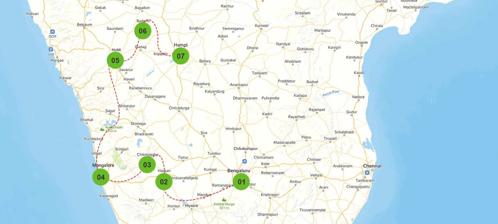 Take a journey that highlights Mangalore’s coastal charm, Chikmagalur’s scenic coffee estates, Hubli’s vibrant culture, Badami’s ancient rock-cut temples, Hampi’s stunning ruins, Hassan’s historical sites, and Bangalore’s modern urban energy.