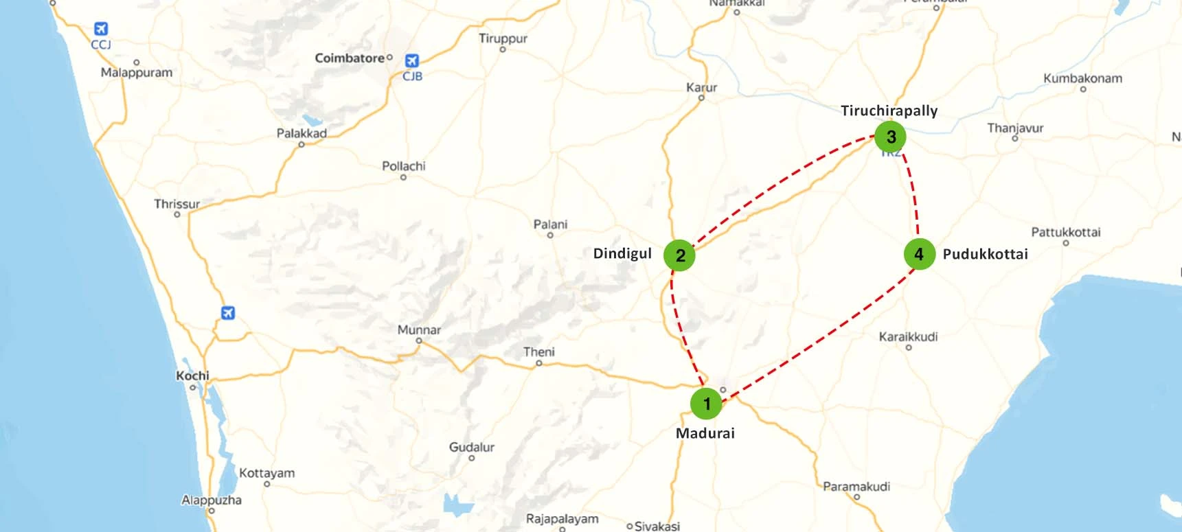 Your adventure begins in Madurai, one of the oldest cities in India, known for its stunning Meenakshi Amman Temple and vibrant street life. From there, travel to Dindigul, famous for its fortress and breathtaking views of the surrounding hills. Next, explore Pudukkottai, where you can discover its rich archaeological sites and the historic Thirumayam Fort. Finally, conclude your journey in Tiruchirapally, home to the iconic Rockfort Temple and the serene Kaveri River. This itinerary promises a deep dive into the historical and cultural treasures of Tamil Nadu, making it an unforgettable experience for every traveler.