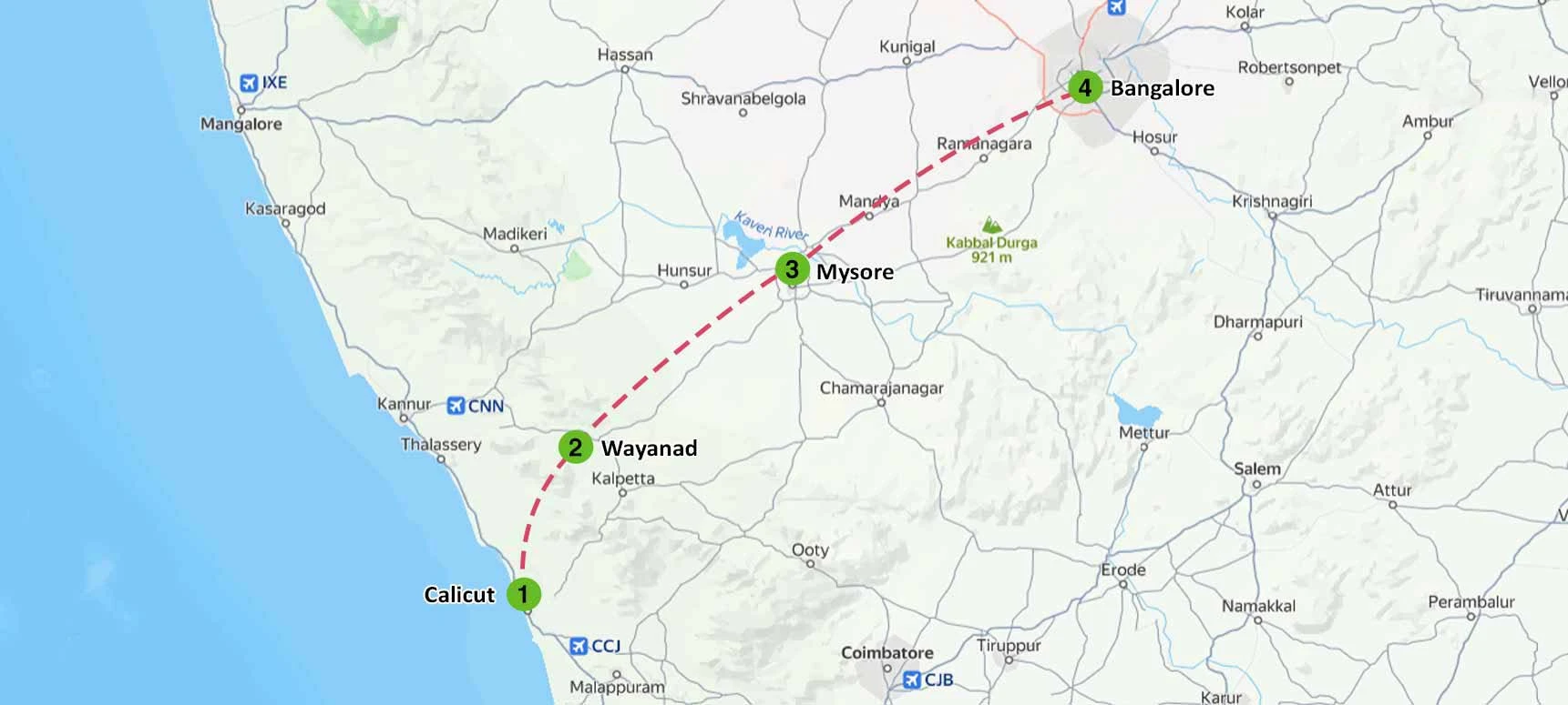 The historical charm of Calicut, the natural beauty and wildlife of Wayanad, the regal splendor of Mysore, and the urban vibrancy of Bangalore.