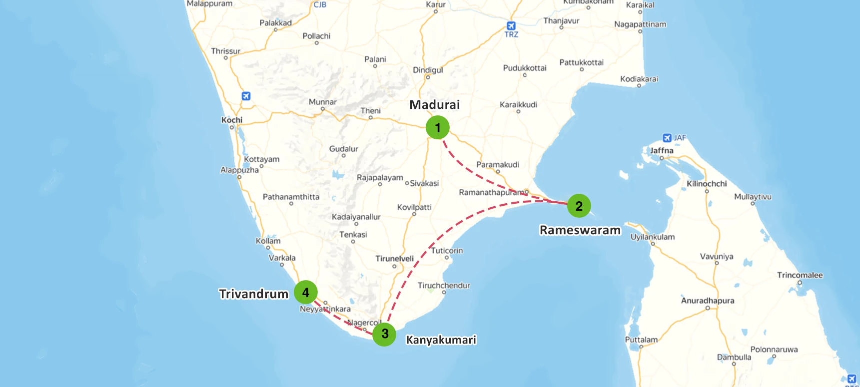 As you embark on this journey with us, follow the map to trace the iconic stops along your route. Each destination reveals unique cultural treasures and spiritual landmarks, taking you through a carefully crafted experience across South India. From ancient temples to serene coastal views, each stop offers moments to savor, creating an unforgettable adventure tailored just for you.