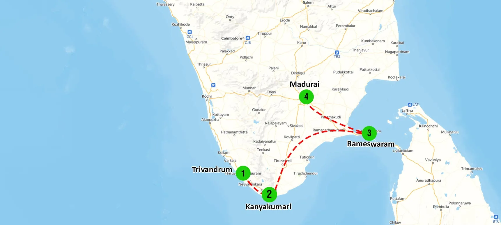 Embark on a transformative journey through some of South India's most revered spiritual destinations with this captivating itinerary. Starting in Trivandrum, the capital of Kerala, you'll explore the grandeur of the Padmanabhaswamy Temple and the rich heritage of the region. The journey then leads you to Kanyakumari, where the confluence of three oceans meets at the southern tip of India, offering breathtaking sunrises and sunsets. Next, visit Rameswaram, a pivotal pilgrimage site known for its temples dedicated to Lord Shiva, including the iconic Ramanathaswamy Temple, which holds immense significance in Hindu mythology. Finally, your adventure concludes in Madurai, home to the magnificent Meenakshi Amman Temple, a marvel of Dravidian architecture and a hub of cultural vibrancy. This itinerary not only promises spiritual enrichment but also immerses you in the rich traditions and breathtaking landscapes of South India.