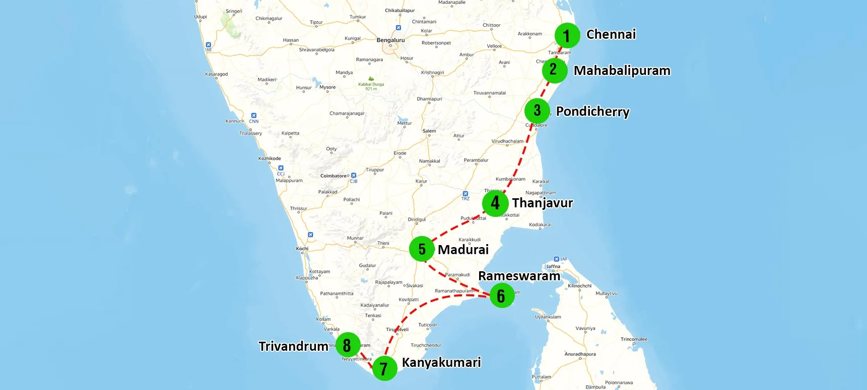 Experience Chennai's bustling cityscape, Mahabalipuram's ancient temples, Pondicherry's French charm, Thanjavur's grand Brihadeeswarar Temple, Madurai's Meenakshi Temple, Rameswaram's sacred sites, Kanyakumari's stunning confluence of seas, and end with the cultural richness of Trivandrum.
