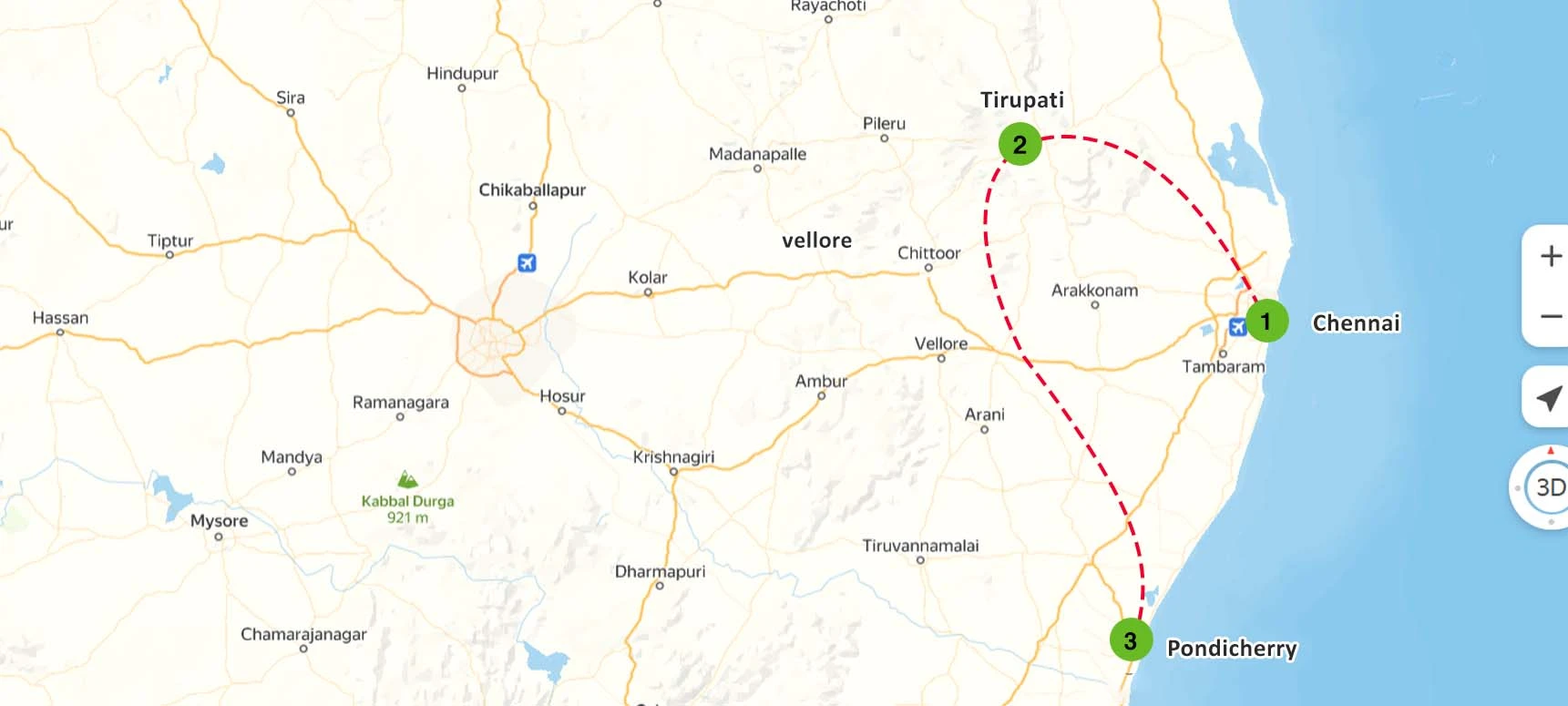A journey through Chennai's vibrant culture and beaches, Tirupati's famous pilgrimage site, and Pondicherry's serene French colonial charm and peaceful beaches.