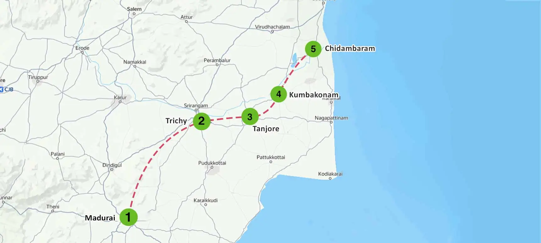 As you set out on this enchanting journey with us, use the map to trace your path through the spiritual and cultural wonders of Tamil Nadu. Each destination brings its own unique experiences and unforgettable moments, guiding you through a meticulously crafted adventure designed just for you.