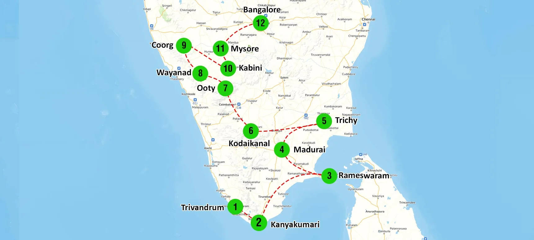As you embark on this remarkable journey through South India, use the accompanying map to navigate the essential stops along the way. Discover the vibrant culture, stunning landscapes, and historical treasures that await you at every turn, making this trip a memorable exploration of South India's diverse charm.