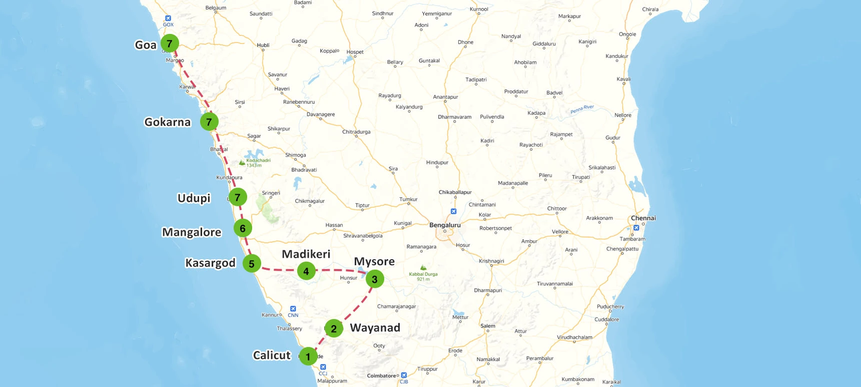 Embark on a journey where every stop tells a story. Begin with the coastal charm of Calicut, ascend to the serene hills of Wayanad, and experience the regal elegance of Mysore. Lose yourself in the lush greenery of Madikeri, explore the cultural tapestry of Kasargod, and savor the coastal beauty of Mangalore and Udupi. Find tranquility in the spiritual aura of Gokarna and unwind on the vibrant beaches of Goa.