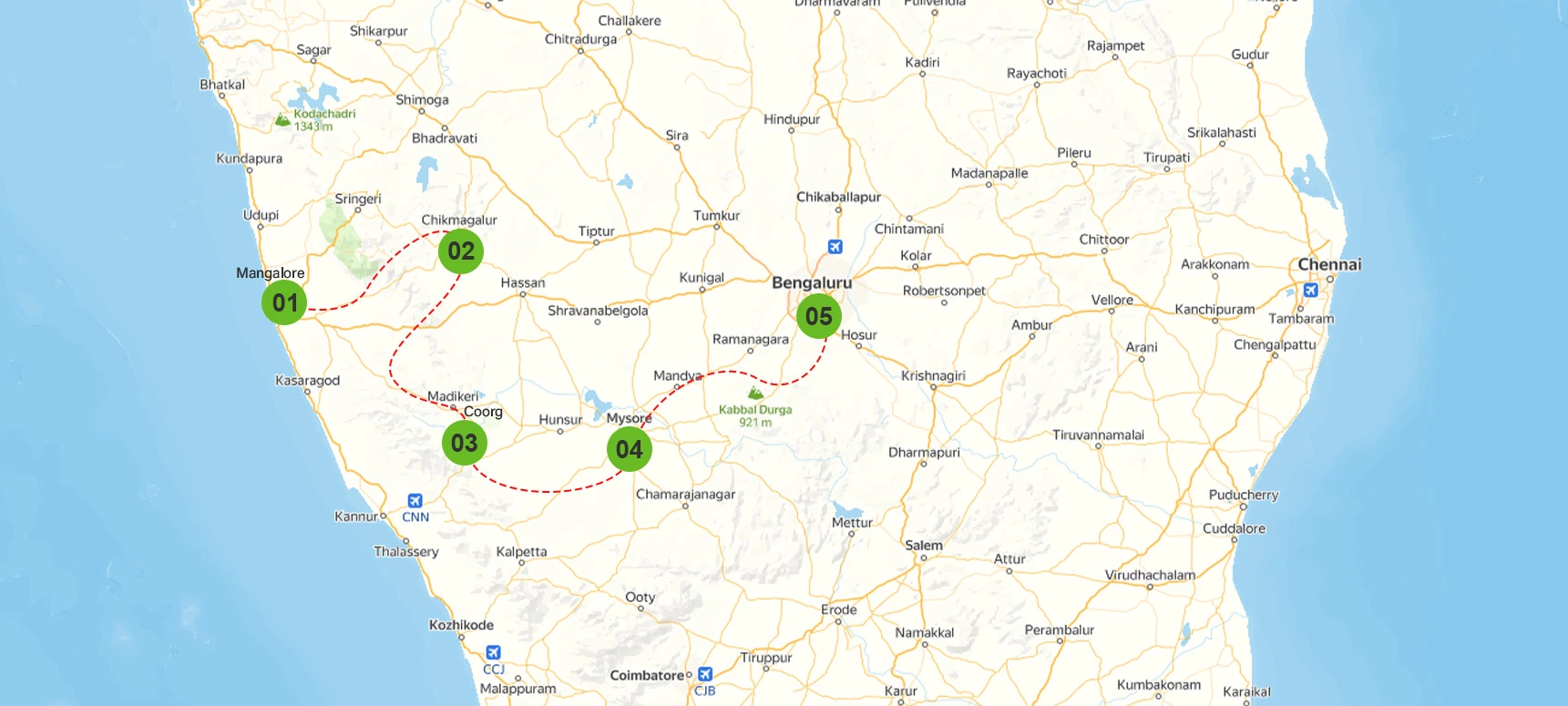 Fall into the beauty of contrasting landscapes from the Western Ghats to vibrant cityscapes. Take this journey that features Mangalore's coastal allure, Chikmagalur’s scenic coffee plantations, Coorg’s lush landscapes and serene retreats, Mysore’s royal heritage with the majestic palace, and Bangalore’s dynamic city life.